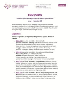 Policy Shifts, a revamp of our previous Canada at a Glance bulletin, focuses on recent VAW-related bills and legislation and VAW-related policy changes and consultations for every province and territory and at the federal level. This includes domestic violence leave, tenant rights, custody considerations in family law, Clare’s Law, and more.